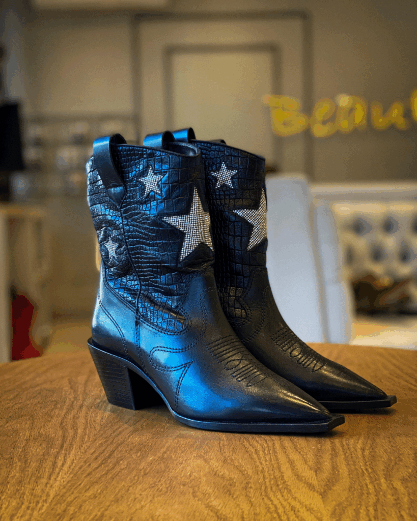 Com um shape western super em alta, ela traz personalidade na medida certa — o couro com textura croco e as aplicações de estrelas com brilho criam um visual moderno e ousado, ideal para quem ama looks autênticos e estilosos. O salto bloco garante conforto e presença, combinando com vestidos de tricot, calças jeans flare ou até peças mais minimalistas, onde a bota vira o destaque da produção.