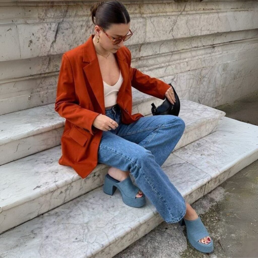 Para looks mais elegantes, que tal um salto bloco em tom areia com conjunto de alfaiataria em cores claras?