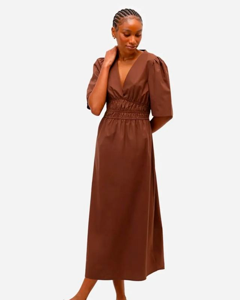 Vestidos midi em tons neutros, terrosos ou até estampados ficam incríveis com esse modelo. O dourado adiciona charme e equilíbrio à produção.