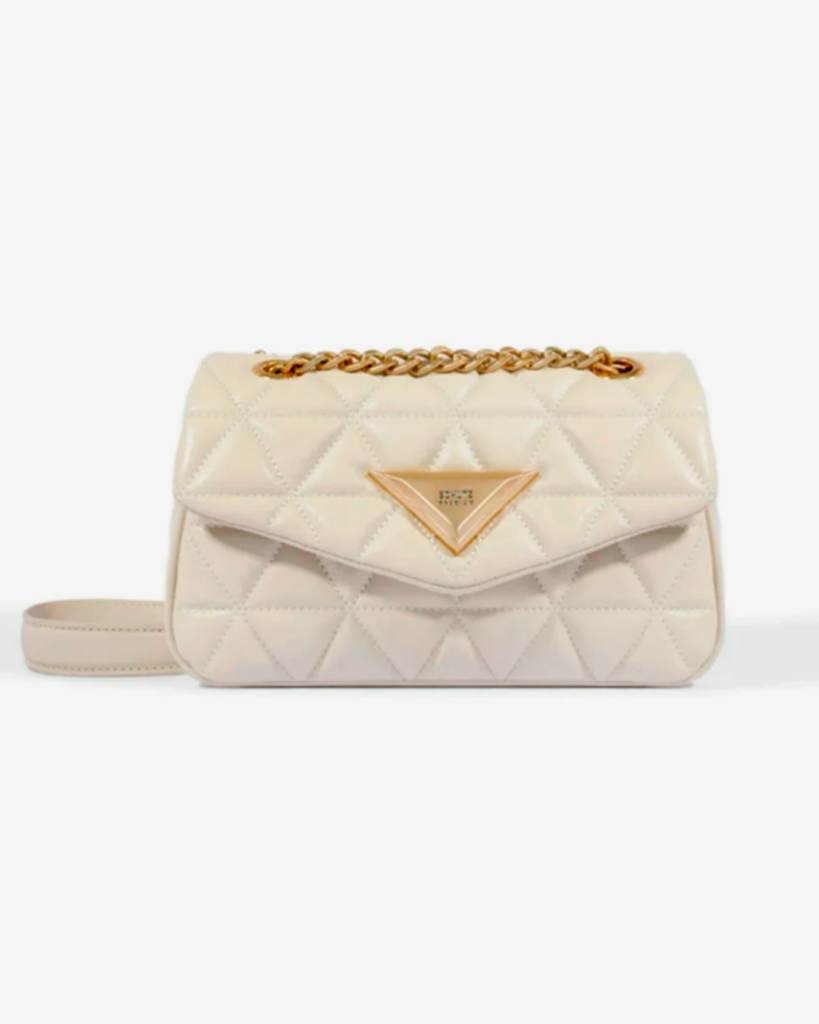 Com textura matelassê, aplicação do triângulo frontal e alça de corrente, ela combina sensualidade e sofisticação na medida certa. A versão em Sugar White traz modernidade e elegância, perfeita para looks diurnos ou noturnos.