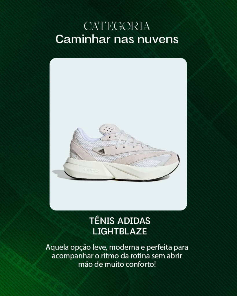 No universo fashion, conforto também merece um prêmio. Na categoria “Caminhar nas Nuvens”, o destaque vai para o Tênis Adidas Lightblaze, um modelo que combina leveza, tecnologia e design contemporâneo.