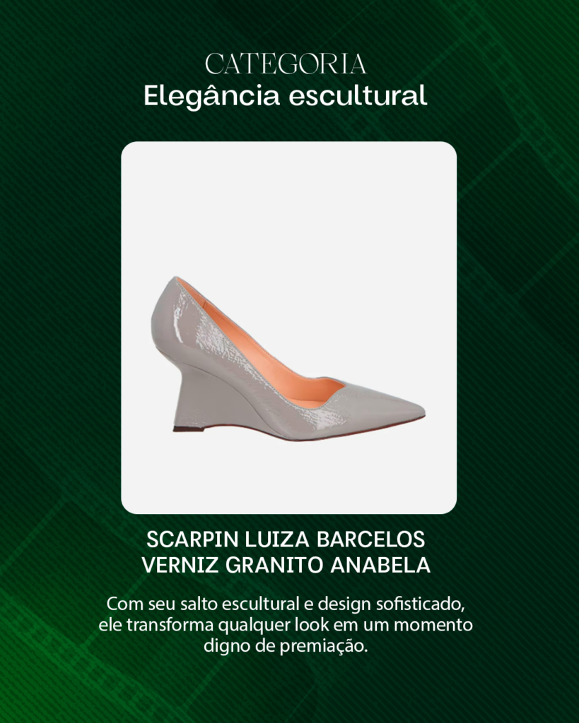 Com um salto escultural e um design que lembra verdadeiras obras de arte contemporâneas, o modelo traz sofisticação instantânea para qualquer produção. O acabamento em verniz e o formato elegante criam um visual moderno e refinado.