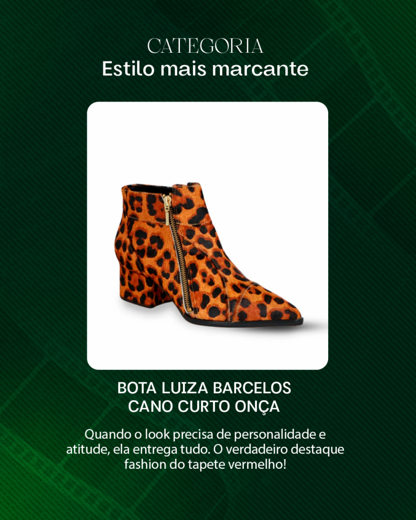 Se existe uma tendência que nunca perde espaço nas passarelas e no street style, é o animal print. E na nossa premiação inspirada no Oscar 2026, a categoria “estilo mais marcante” só poderia ir para a Bota Luiza Barcelos Cano Curto Onça.