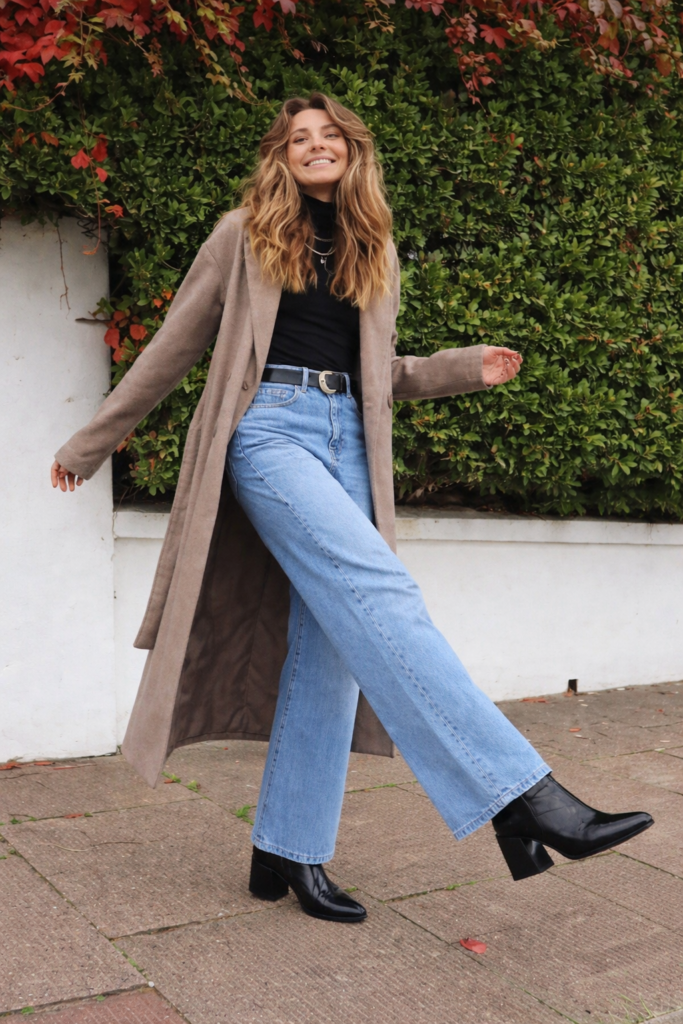 A calça wide leg é uma das maiores tendências do inverno 2026 e combina perfeitamente com uma bota de cano curto texturizada. O segredo é deixar a bota aparecer embaixo da barra larga, criando uma silhueta alongada e muito chique.