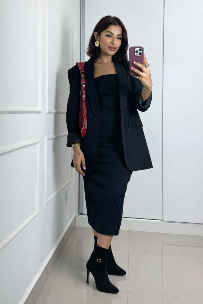 O vestido midi é um dos grandes queridinhos do inverno 2026, e quando combinado com uma bota de salto fino em nobuck preto, o resultado é simplesmente irresistível. Esse é o tipo de look que funciona tanto para um jantar especial quanto para uma reunião importante.