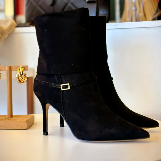 A bota de cano longo em camurça é a peça mais versátil e ousada desta lista. Ela transforma qualquer saia midi em um look de editorial, com aquele equilíbrio sofisticado entre o escuro e o claro.