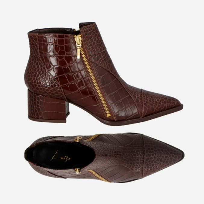 A alfaiataria continua dominando o inverno 2026, e quando encontra uma bota de cano curto em couro croco marrom, forma uma das duplas mais sofisticadas da temporada. O padrão croco adiciona textura sem exagero, elegância em cada detalhe.